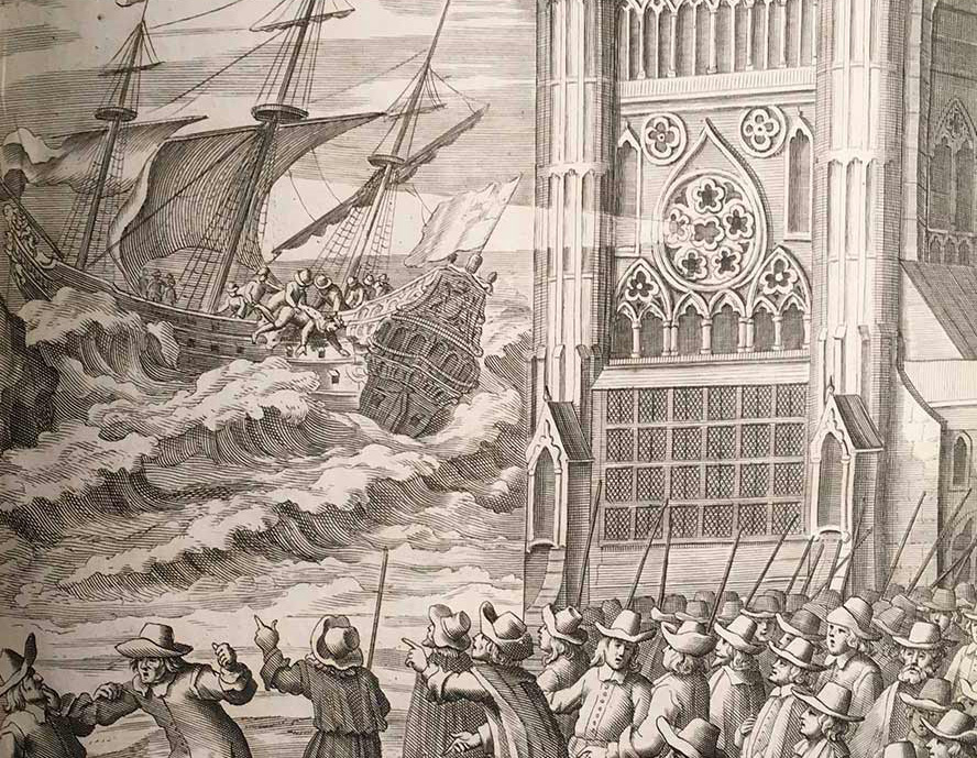 Main Picture Credit: “An allegorical engraving printed in 1683 shows the ‘ship of state’ in stormy waters with the king being thrown overboard, while Westminster stands firm”. © 2022 English Heritage.