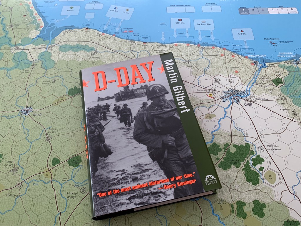 Picture Credit: “D-Day” by Sir Martin Gilbert sitting atop an intricate map of the Normandy landing sites taken from the military simulation “Normandy ’44” by GMT Games. Author’s collection.