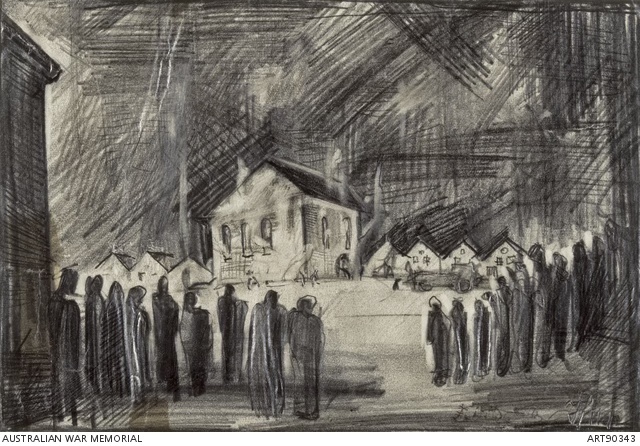 Picture credits: Australian War Memorial Collection: “Palenie synagogi (The burning of the synagogue)” by Slawik, Bernard. © 1943 Bernard Slawik, fair use claimed.