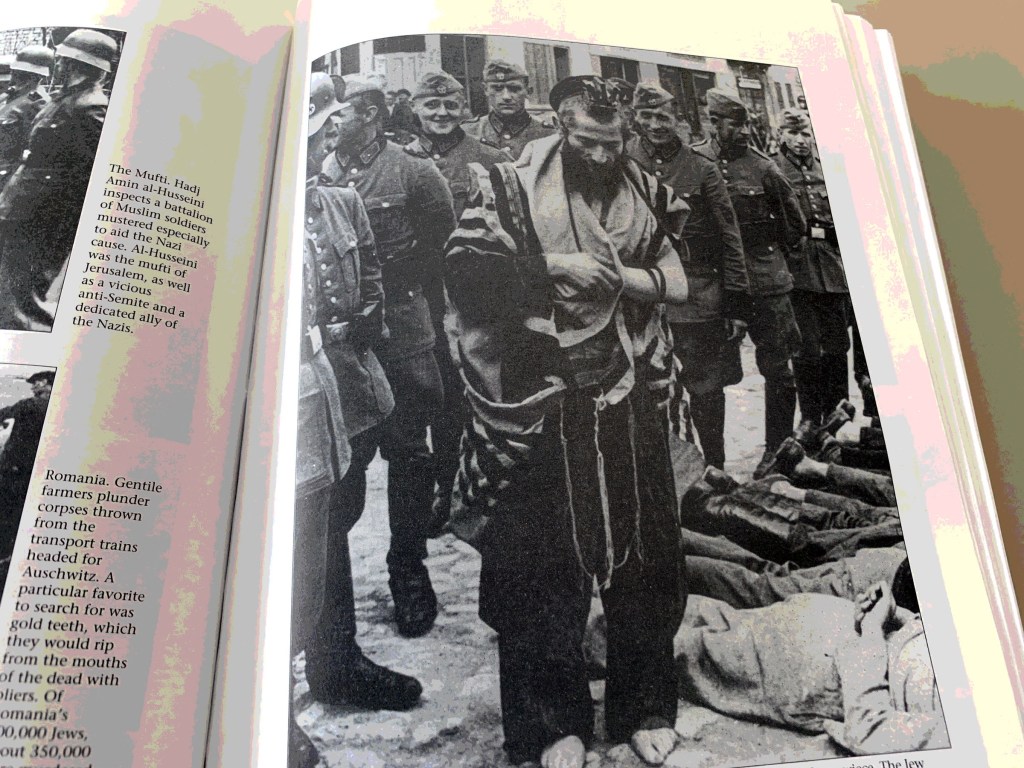 Picture credit: Olkusz, Poland, 1940. A Jewish man is forced to stand in his synagogue worship garb, prayer shawl torn and head phylactery box broken by laughing German soldiers. Fellow Jews lay dead at his bare feet. From © 2002, Shema Yisrael Testimonies of Devotion, Courage and Self Sacrifice 1939-1945. Michigan, Targum Press. Author’s collection.