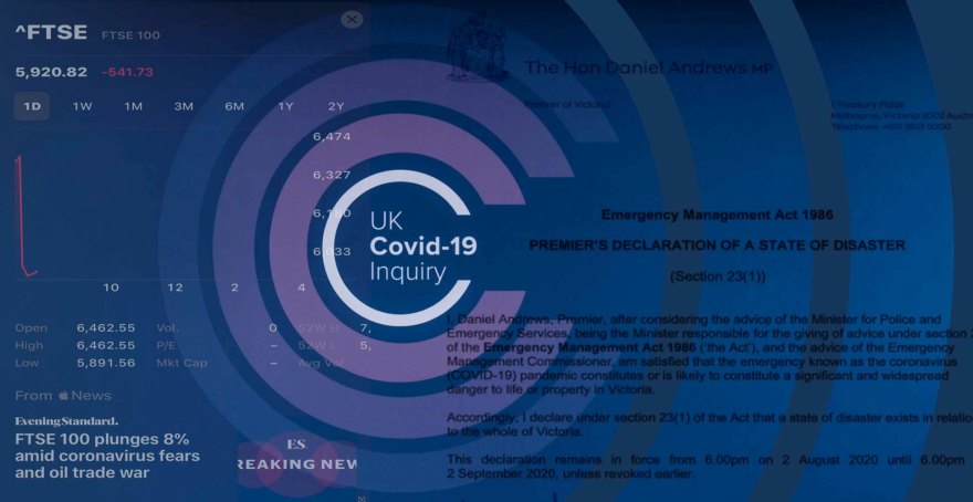 Picture credit: With Covid-19 in the air on March 9 2020 the UK’s FTSE Index fell 8%. On August 2 2020 Victoria, Australia, declared a state of emergency. Author’s Covid-19 screenshot collection.
